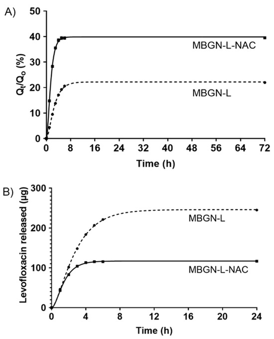 “In vial” cumulative levofloxacin release profiles from MBGN-L and MBGN-L-NAC nanosystems at pH 6.0 in PBS during 72 h (A). QT refers to the amount of released levofloxacin versus time, and Q0 refers to the total amount of loaded levofloxacin into the material. (B) Amount of levofloxacin released from both materials during the first 24 h.