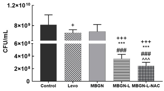 Viability of mature bacterial biofilm after 24 h of treatment with the different synthesized nanosystems. Statistical significance: + p < 0.05 vs. Control, +++ p < 0.005 vs. Control, *** p < 0.005 vs. Levo, ### p < 0.005 vs. MBGN, ^^^ p < 0.005 vs. MBGN-L.