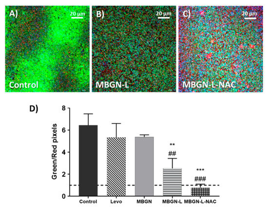 Confocal studies after treating the biofilms for 24 h with the different nanosystems. Confocal images of the (A) Control, (B) MBGN-L, and (C) MBGN-L-NAC-treated biofilms. (D) Ratio of Alive vs. Dead bacteria. (** p < 0.01 vs. Levo, *** p < 0.005 vs. Levo, ## p < 0.05 vs. MBGN, ### p < 0.005 vs. MBGN).