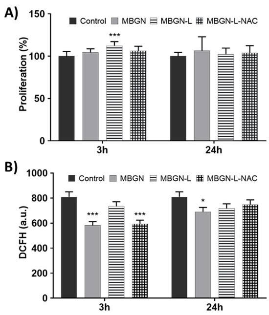 The biocompatibility of the different nanoparticles was tested in MC3T3-E1 murine pre-osteoblast culture in vitro. Regarding the number of nanoparticles added to the cell culture, the same conditions with respect to the in vitro antimicrobial evaluation were used. Figure 7A shows that the proliferation rate referred to in the control is maintained in all the conditions tested, even enhanced in the 3-h contact with the MBGN-L condition. Figure 7B shows that all the nanosystems reduce the ROS intracellular content compared to the control at a 3-h contact, with statistically significant differences for MBGN and MBGN-L-NAC. This reduction of intracellular ROS content is also observed after 24 h, although only the MBGN condition significantly reduces this parameter compared to the control.