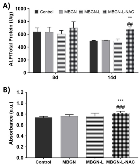 Figure 8A shows the alkaline phosphatase activity measurements. No significant differences can be observed at 8 days of cell culture, while at 14 days of cell culture, the pre-osteoblasts treated for 24 h with MBGN-L-NAC condition show a significant increase in alkaline phosphatase activity compared to control and MBGN conditions. Figure 8B shows the mineralization of calcium deposits after 21 days of differentiation. Treatment of pre-osteoblasts for 24 h with MBGN-L-NAC leads to a slightly but statistically significant increase of calcium mineralization compared to control and MBGN conditions.
