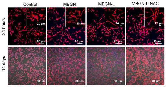 Confocal and phase contrast microscopy images of MC3T3-E1 cells treated with MBGN, MBGN-L, and MBGN-L-NAC for 24 h and after 14 days of culture post-treatment. Staining: Nuclei (DAPI, blue), Cytoskeleton (Phalloidin, red). The selected confocal plane is the closest to the coverglass.