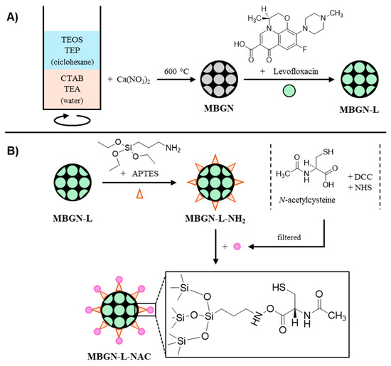 Schematic representation of the synthesis of the different nanomaterials prepared in this work. (A) Synthesis of MBGN and levofloxacin loading to obtain MBGN-L. (B) Functionalization of MBGN-L with APTES for NAC anchoring to obtain MBGN-L-NAC.