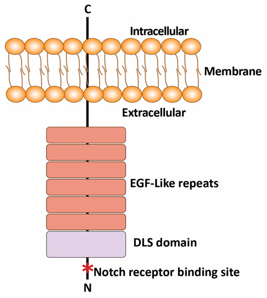 A schematic representation of the DLL3 structure. The domains of DLL3, including the extracellular EGF-like repeats, the Delta/Serrate/LAG-2 (DLS) domain which is critical for ligand–receptor interactions, and the N-terminus (N) and C-terminus (C), are labeled, highlighting that DLL3 is a single transmembrane protein.