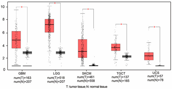 DLL3 expression in tumor and adjacent normal tissues (data source: TCGA and GTEx). GBM: glioblastoma; LGG: lower-grade glioma; SKCM: skin cutaneous melanoma; TGCT: tenosynovial giant-cell tumor; UCS: uterine carcinosarcoma. * p < 0.05.