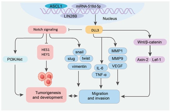 The regulatory network of DLL3 in cellular signaling. DLL3 involves key molecular interactions, including its modulation by ASCL1 and miRNA-518d-5p and cross-talk with Notch, PI3K/Akt, and Wnt/β-catenin pathways. DLL3-mediated Notch inhibition coupled with Wnt activation (through Wnt-1/4, Axin-2, and Lef-1 upregulation) and PI3K/Akt stimulation drives tumor progression by inducing EMT markers (snail, twist, vimentin), matrix metalloproteinases (MMP1 and MMP9), and pro-angiogenic factors (VEGF), while promoting an inflammatory microenvironment (IL-6, TNF-α), that collectively facilitate tumor migration and invasion.