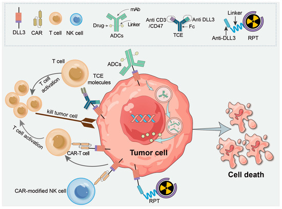 The results of pre-clinical and clinical trials indicate that the DLL3 located on cell membrane is a potential target for tumor treatment [8,21,57]. Various therapeutic approaches targeting DLL3 are being explored, including ADCs, precision immunotherapy, and radiopharmaceutical therapy (Figure 4). As regards ADCs, the anti-DLL3 antibody binds to tumor cells to stimulate endocytosis, thereby delivering the cytotoxic drug payload (e.g., the DNA alkylating agent in Rova-T) into the cell. In cellular immunotherapies involving CAR-T or CAR-NK cells, the objective is to use the cell-surface DLL3 as a target to induce immune cell cytotoxicity. In radiopharmaceutical therapy, the radiolabeled anti-DLL3 antibody delivers radiation, inducing lethal damage not only in tumor cells with high DLL3 expression but also in neighboring malignant cells (bystander effect). Table 1 lists the ongoing clinical trials targeting DLL3.