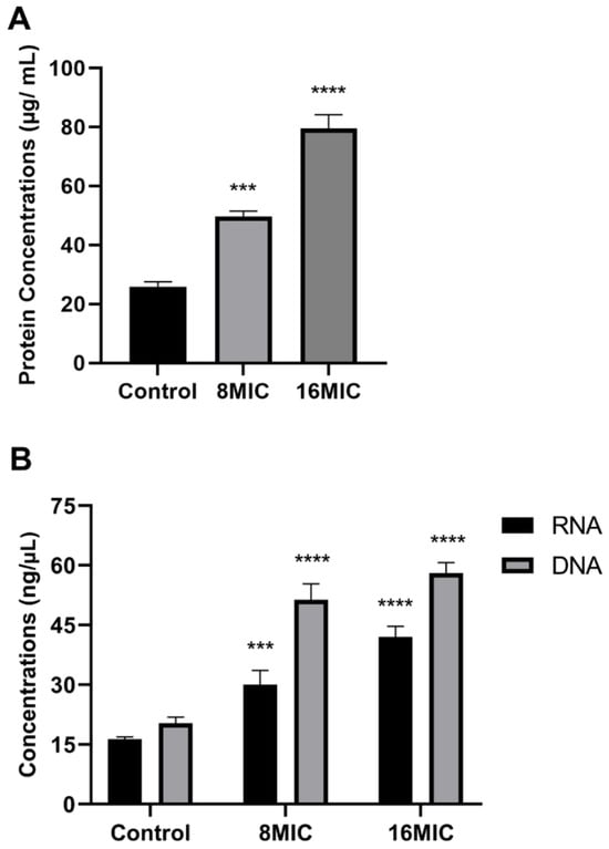 2.10. Determination of Leakage of DNA, RNA, and Protein Concentrations in Bacterial Cell