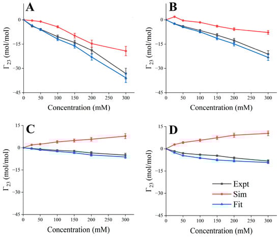 Comparison of experimental and simulated Γ23 as a function of excipient concentration. (A) Succinic acid; (B) Arg·HCl; (C) mannitol; (D) sucrose.