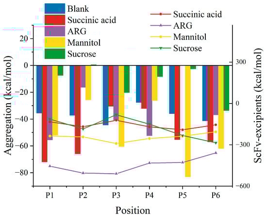 Binding energy of bsScFv aggregates from different initial positions (bar chart) and binding energy between bsScFv and each excipient (point-line graph).