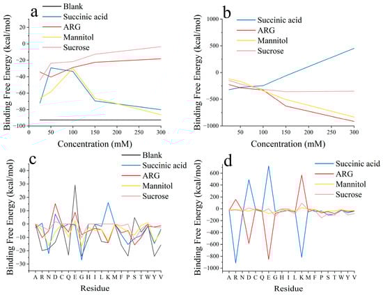 RSA binding energy, excipient–bsScFv binding energy, and corresponding residue decomposition. (a) RSA binding energy of bsScFv; (b) binding energy between bsScFv and excipients; (c) RSA binding energy contributions of each residue; (d) binding energy between each residue and excipients.