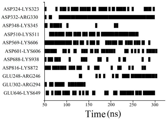 Based on the above study performed with different initial positions, we further investigated the effect of excipient concentration on RSA. P6, which has the highest RSA formation energy, was chosen as the initial position. Succinic acid at a concentration of 50 mM had a much better inhibitory effect on RSA than that at 150 mM (Figure 4). This does not mean that 150 mM succinic acid has a higher inhibitory effect on RSA formation than 50 mM succinic acid, but rather, that the inhibitory effect on RSA at a concentration of 50 mM is close to saturation. Despite the initial positions being set to probably aggregate at specified sites, in the 150 mM succinic acid system, the two bsScFv molecules still deviated from each other and interacted with the mirror image of one another (Figure S6). Differing from succinic acid, the increase in ARG+ concentration was more favorable for ARG+ in competing for the negatively charged regions on the bsScFv surface, and ARG+ primarily bound to the residues GLU and ASP to reduce the RSA driving force provided by electrostatic interactions. We also found that ARG+ affected the formation and breaking of salt bridges between some residues in bsScFv (Figure 5), while other excipients did not have such an obvious effect on salt bridges, meaning that ARG+ may change the conformation of bsScFv. Significant self-association of ARG+ was observed in the system (Figure S8), which was not observed at high concentrations of succinic acid. This association weakened the electrostatic shielding effect of high-concentration ARG+.