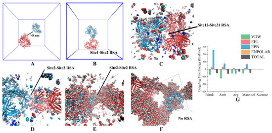 The structure of RSA simulation using the long-term annealing method in a large system. (A) Original structure; (B) RSA in blank; (C) RSA in 50 mM succinic acid; (D) RSA in 50 mM Arg·HCl; (E) RSA in 300 mM mannitol; (F) RSA in 300 mM Sucrose; (G) Formation energy of RSA.