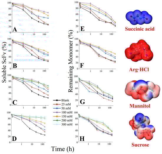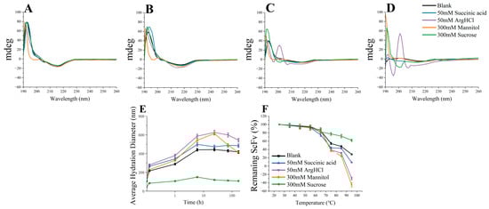 The thermal stability was characterized by the soluble residual content after thermal incubation at different temperatures for 10 min (Figure 8F). The soluble residual content was also determined by means of UV absorbance at 214 nm, but buffers of these samples were not replaced with ultrafiltration centrifuge tubes. Similarly, sucrose had a higher inhibitory effect on the growth of oligomers at high temperatures than other excipients. The addition of succinic acid slightly reduced the thermal stability. The soluble residual content of mannitol and Arg·HCl groups dropped to a negative number because the absorption value of the buffer needed to be subtracted when calculating the residual content. The absorption value of the sample after 95 °C bath for 10 min was lower than the absorption value of the buffer, which indicated that mannitol and Arg·HCl were largely involved in the formation of aggregation and precipitate with the aggregates. The simulation results also indicated that the binding energy between mannitol and bsScFv was the strongest, and it was favorable for the formation of RSA, which is possibly the reason why the monomers in the mannitol group were more likely to convert into oligomers.