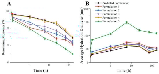 Thermal incubation experiment results of multiple formulations. (A) Remaining monomer after thermal incubation experiment; (B) average hydration diameter after thermal incubation experiment.