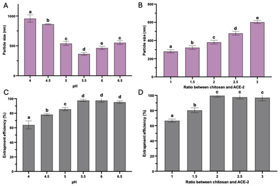 Figure 1. Effect of pH on particle size (prepared at the 3:1 mass ratio of chitosan and ACE-2) (A); effect of mass ratio between chitosan and ACE-2 on particle size (prepared at pH 6) (B); effect of pH on entrapment (encapsulation) efficiency (prepared at the 3:1 mass ratio of chitosan and ACE-2) (C); and effect of mass ratio between chitosan and ACE-2 on entrapment (encapsulation) efficiency (prepare at pH 6) (D). Values represent means ± SD (n = 3). Letters a–e denote significantly different (p < 0.05) groups.