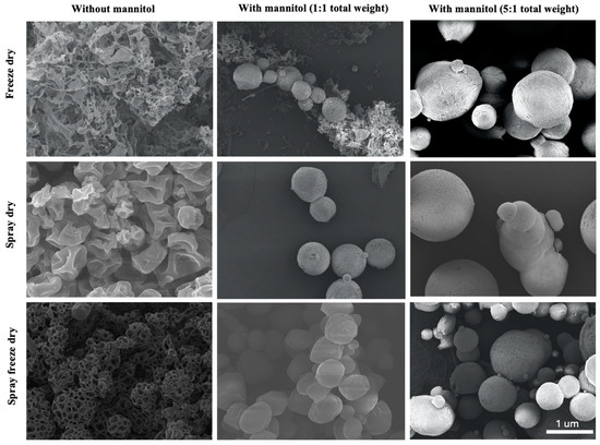 The analysis of the morphological characteristics of dried ACE-2NPs prepared using FD, SD, and SFD were performed to select the best dehydration technique for powder formation. The preferred approach should include drug stability, uniform particle shape, high drug loading, and good reconstitution ability. In this study, as FD techniques were involved, we also evaluated the impact of mannitol as a bulking agent. Hence, in all three dehydration techniques examined, mannitol had a dual role as a filler and as a cryoprotector to maintain the spherical morphology of the ACE-2 NPs [18]. ACE-2 NPs dried without mannitol present and with mannitol at a weight ratio of 1:1 and 5:1 was compared. For FD, ACE-2 NPs without mannitol produced a highly porous structure with an irregular and rough surface, as shown by SEM, in Figure 2. After dehydration, only a few particles could be detected in the mixture. This result indicated that most of the ACE-2 NPs were degraded during the process of FD without mannitol present as a cryoprotectant. With the mannitol, a portion of the spherical particles were detected in FD ACE-2 NPs at a mannitol weight ratio of 1:1. SD ACE-2 NPs with mannitol present had weight ratios of 1:1 and 5:1, compared to SFD with same mannitol ratios, showing spherical particles and a smooth surface observed. SD ACE-2 NPs without mannitol retained the spherical structure, but also had irregular, craggy surfaces, while SFD ACE-2 NPs without mannitol present showed a spherical structure with highly porous surfaces.