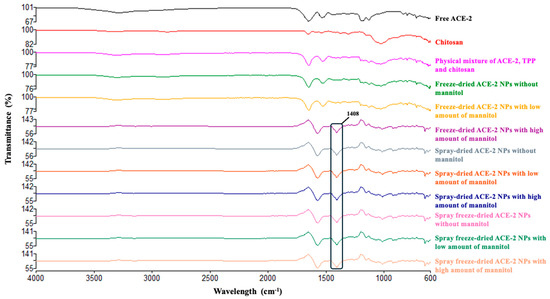 Figure 3. FTIR–ATR spectra of free ACE-2, chitosan, physical mixture of chitosan/TPP/ACE-2, and ACE-2 NPs dehydrated at varying mannitol concentrations by different drying methods. The different conditions used to derive the NPs are provided at the right of the diagram spectrum.