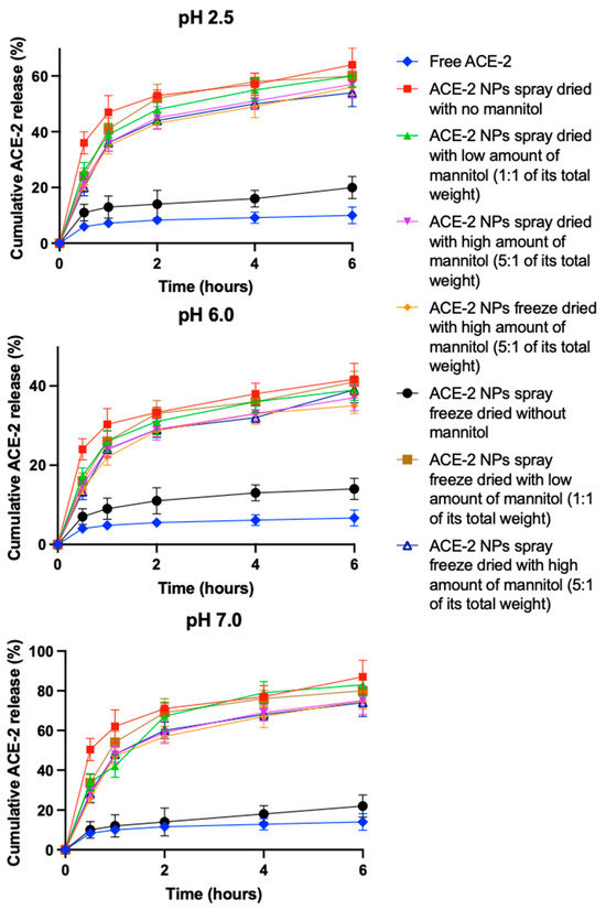 To simulate the pH environment of the stomach, duodenum, and upper small intestine, respectively, free ACE-2 and redissolved dried ACE-2 NPs were incubated in different buffers (e.g., pH 2.5, 6.0, and 7.0, respectively) with added pepsin (0.5 mg/mL) and incubated at 37 °C in a water bath for 6 h. The results showed first-order kinetics (Table S1). All NPs exhibited an initial release of ACE-2 in the first hour, followed by a slow release over the next 5 h in all buffer solutions that simulated different gastrointestinal environments (Figure 4). This observed rapid initial release was attributed to the high concentration difference at the beginning of the incubation period and the rapid surface desorption of ACE-2 molecules that were not completely anchored to the internal structure of the particles. All NPs exhibited the highest release of ACE-2 at pH 7, followed by pH 2.5 and pH 6.0. This result can be attributed to the fact that the deprotonation of chitosan occurs at higher pHs, thus resulting in a less compact polymer network and greater the release of the loaded ACE-2. Furthermore, based on the kinetic model, the SD-processed ACE-2 NPs (Table S1) without mannitol added showed the fastest release profile, followed by ACE-2 NPs processed by SD and SFD, respectively, both containing the low amount of mannitol (1:1 of its total weight). Release was different between ACE-2 NPs prepared by SD and SFD, each containing a high amount of mannitol (5:1 of its total weight) present, and the FD ACE-2 NPs, which also comprised a high amount of mannitol (5:1 of its total weight). This finding is consistent with the relative order of the particle sizes for redissolved ACE-2 NPs (Table 1), where the smallest particle size had the fastest release rate. Small particles with a larger surface area facilitate the ACE-2 location close to the particle surface, thus resulting in a rapid rate of release. It can also be noted that SFD-processed ACE-2 NPs without mannitol present produced a relatively low ACE-2 release compared with the other treatments (Table S1) (Figure 4), indicating that a highly porous surface and low EE did not protect ACE-2 degradation in the presence of pepsin.