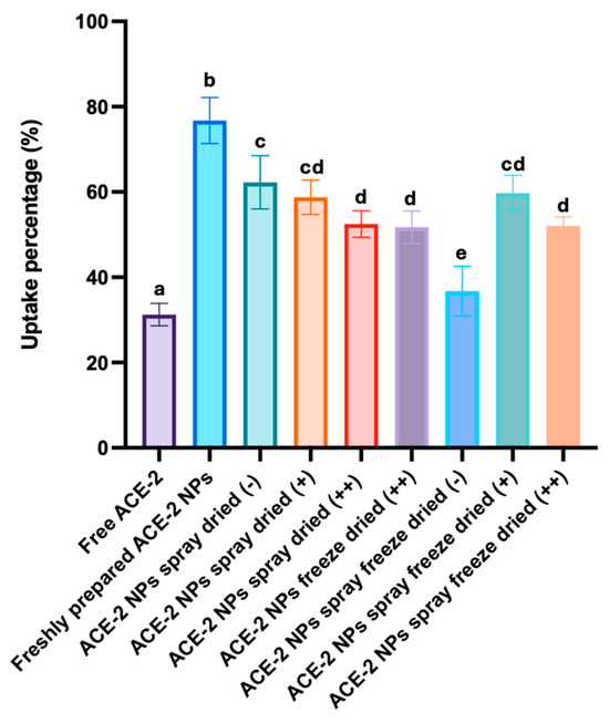Figure 5. Caco-2 cell relative uptake of ACE-2, freshly prepared ACE-2 NPs, and ACE-2 NPs dehydrated in different ways. − = no mannitol; + = low mannitol; ++ = high mannitol. Values represent mean + SD (n = 3). Different superscripts a,b,c,d,e in rows represent statistical differences (ANOVA; p < 0.05).