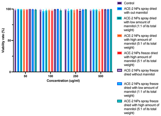 The MTT assay was used to determine the possible cytotoxicity of all dehydrated ACE-2 NPs (Figure 6). Neither free ACE-2 nor dehydrated ACE-2 NPs showed any signs of Caco-2-reduced cell redox balance at concentrations ranging from 50 to 500 μg/mL.