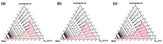 Pseudo-ternary phase diagrams of the chosen oil (LGO), surfactant (Tween® 80), and co-surfactant (PG) were constructed using the water dilution method to identify the SNEDDS region. Upon visual observation, SNEDDS was classified as translucent or transparent homogeneous mixtures when diluted with water. The pseudo-ternary phase diagrams revealed that three systems containing surfactant and co-surfactant (Smix) ratios of 2.3:1, 2.5:1, and 3:1 exhibited slight differences in the SNEDDS region, as shown in Figure 1a–c. It was observed that the SNEDDS region contracted as LGO concentrations increased and Smix concentrations decreased. Accordingly, all SNEDDS zones were considered, and concentrations of LGO (10% and 20% (w/w)) and Smix (80% and 90% (w/w)) were selected for continued investigation.