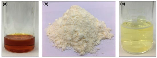 Physical appearance of (a) GL-SNEDDS with 200 mg/g of GE, (b) GL-mouthwash powder, and (c) GL-mouthwash powder after dispersion with water.