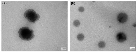 TEM micrographs of GE-F5 of (a) GL-SNEDDS; and (b) GL-mouthwash powder after being reconstituted in water at a magnification of 50,000.