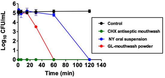 Time killing kinetic analysis was conducted to determine the rapidity and duration of antifungal activity. In the present study, GL-mouthwash powder was prepared and reconstituted in water to produce a clear mouthwash solution containing 2.5 mg/mL of GE and LGO. According to our preliminary studies, this final concentration corresponds to a 1-fold minimum biofilm inhibition concentration (MBIC) for GE and a 4-fold MBIC for LGO against a clinical isolate C. albicans R01. This combination displayed an additive effect, inhibiting biofilm formation by 90%.