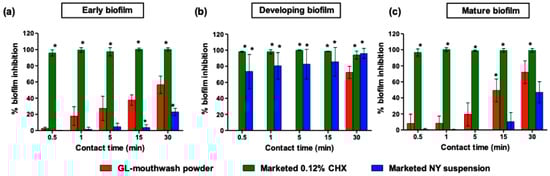 Percentage of biofilm inhibition of each mouthwash at different times on C. albicans R01 cells embedded in (a) early, (b) developing, and (c) mature biofilm. Asterisks (*) demonstrate the significant difference between GL-mouthwash powder and CHX antiseptic mouthwash and NY oral suspension (p < 0.05).
