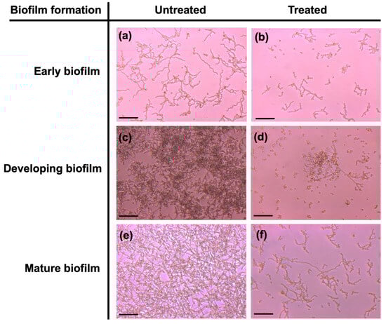 The morphology of C. albicans R01 biofilm formation was observed in three stages—early, developing, and mature—both untreated (a,c,e) and treated (b,d,f) with GL-mouthwash powder, using an optical microscope. Data are presented as means ± SD (n = 3). One representative image from three independent experiments is shown at 400× magnification, with a scale bar of 50 μm.