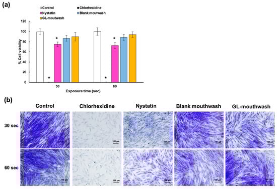 Cytotoxicity of GL-mouthwash investigated in NHDF cells over time; (a) cell viability using MTT assay, and (b) cell integrity and density using crystal violet staining. Asterisks (*) demonstrate the significant compared with control (p < 0.05).