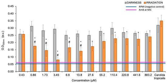 MIC determination of parietin (PTN) under darkness and irradiation conditions. Optical density values obtained for planktonic cells at 530 nm, previously treated with different concentrations of PTN. * p < 0.05 with respect to C. tropicalis. # p < 0.05 darkness vs. irradiation.
