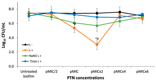 To clarify the photoinactivation mechanism, the amount of photogenerated ROS was analyzed in the presence of specific ROS scavengers or quenchers. Thus, the quenching effect of 200 mM sodium azide on 1O2 or the scavenging of O2•− by 200 mM Tiron on biofilm photoinactivation by PTN is shown in Figure 3. The addition of Tiron completely inhibited the photodynamic effect of PTN at all bioactive concentrations (pMIC and pMICx2). In contrast, sodium azide exhibited approximately half the efficacy of Tiron. Although it was unable to reverse the action of the O2•−, sodium azide significantly increased the survival of biofilms by almost three logs at these concentrations.