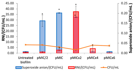 The O2•− generation and nitrosative metabolite production were studied for the photoinactivation process of PTN on C. tropicalis biofilms. An increment in O2•− levels was observed when PTN was photoexcited at pMIC/2, pMIC, and pMICx2 with respect to untreated biofilms (Figure 4, blue bars). In addition, at the higher PTN concentrations tested, no increase in this ROS was detected. In relation to RNI generation by this AQ when it was photostimulated on biofilms (Figure 4, red bars), the rise in RNI was greater for the most active concentration of PTN than the other concentrations tested.
