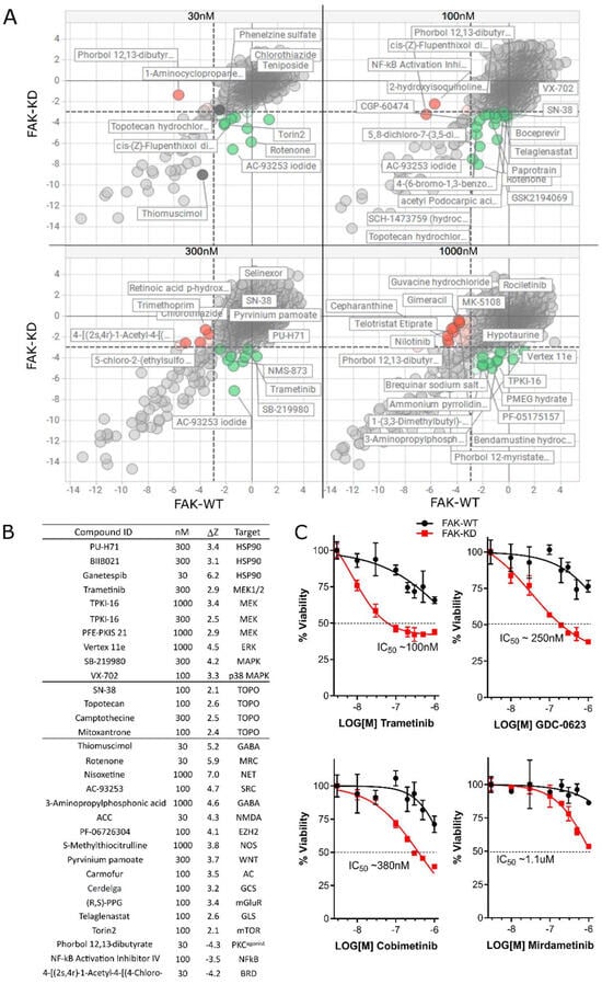 Chemogenomic screening against isogenic FAK-WT and FAK-KD cell lines. (A) X-Y Scatter plots of normalized Z-scores of FAK-WT vs. FAK-KD at 30, 100, 300, and 1000 nM. Key compounds are highlighted: FAK-KD sensitizing—green, FAK-KD antagonists—red. (B) DZ score rank was generated from thresholds of cell survival of FAK-WT cells (z score > −3) versus increased death in FAK-KD cells (z score < −3). Compound hit list with DZ scores > 2 and higher are listed with their annotated target, plus example antagonistic hits DZ < −3. (C) Validation of 4 MEK inhibitors (trametinib, GDC-0623, cobimetinib, mirdametinib) showing loss of FAK kinase activity (red curve) sensitizes cells to MEK inhibition (n = 3 biological replicates). The dashed horizontal line indicates 50% cell viability, commonly used to define IC50 values.
