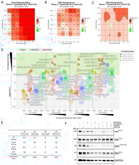 A representative heatmap of the FAK+MEK inhibitor combination matrix showing % inhibition (Figure 2A) and the corresponding synergy score and contour map (Figure 2B,C) is shown, where synergy is indicated by maximal or peak synergy scores in darker red (synergy scores ~10+ across four synergy models preferred). Synergy scores across all combination doses in 2D and 3D are shown (Figure 2D), with three synergy models indicated (BLISS, ZIP, Loewe and HSA [35]) [36,37] and the synergistic zone shaded in green. The X-axis indicates the Combination Synergy Score (CSS), which quantifies the potency of the combination (i.e., significant death caused by the synergy observed, indicated by a CSS > 30) [38]. Trametinib combinations with VS4718 in 2D and 3D are indicated by yellow and green data points, and GDC0623 plus VS4718 in 2D and 3D are indicated by blue and red data points. The most synergistic dose combinations that gave combination index (CI) values < 1 are shown in Figure 2E, with the responses in 3D showing greater effects across all four synergy models. Functional and on-target validation of the MEK and FAK inhibitors used in this GBM cell model was carried out, with reduced phosphorylated (p)-FAK and phosphorylated (p)-ERK, as observed by Western blotting (Figure 2F).