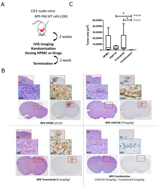 We further assessed the efficacy of the FAK + MEK inhibitor combination in an orthotopic xenograft model established using human G7 glioblastoma cells implanted intracranially in CD1 nude mice. Following tumor formation, the mice were randomized into four groups and treated with VS4718, trametinib, their combination, or vehicle control (hydroxypropyl methylcellulose) for one week, followed by culling (Figure 8A). Paraffin-embedded brain sections were stained with hematoxylin and eosin and human mitochondrial antibody to visualize and quantify the tumor area. The immunohistochemical images revealed a significant reduction in the tumor area in the combination treatment group compared with either monotherapy (Figure 8B). Positive staining was observed in non-tumor regions of the brain, which was later confirmed as non-specific antibody binding (Supplementary Figure S8). Quantitative analysis confirmed that the combination of FAK and MEK inhibitors resulted in a statistically significant reduction in tumor size relative to the monotherapy arms, underscoring the potential of this combination therapy in effectively targeting glioblastoma (Figure 8C). However, it should be noted that weight loss, likely due to systemic toxicity, was observed in some mice in the combination treatment group by the end of the one-week treatment period (Supplementary Figure S5), similar to the findings in the NPE-FAK-WT model.