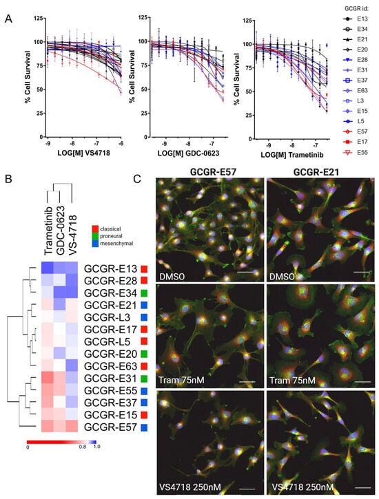 (A) Dose–response validation of FAK inhibitor (VS4718) and MEK inhibitors (trametinib and GDC-0623) across 14 patient-derived glioma stem cell (GSC) lines (n = 3) (B). Heatmap and hierarchical clustering of dose–response data by normalized Area Under the Curve (AUC). AUC data are scaled between 1 (100% inactive) and 0 (100% active). (C) Representative images of E57 and E21 cells in response to VS4718 and trametinib at indicated doses (72 h). Staining by Hoechst (Nuclei, blue), Concanavalin A (ER, red), and Phalloidin (F-actin, green). Scale bar indicates 20 µM.
