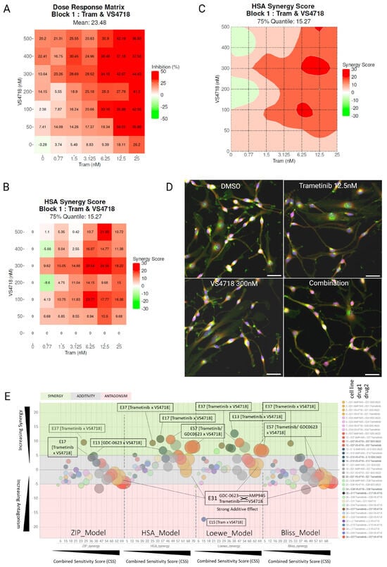 Combination screening (7 × 7 dose combination matrices) of MEK inhibitors (trametinib, GDC-0623) with FAK inhibitors (VS4718, AMP-945) against a panel of 14 patient-derived, human glioma stem cell lines (n = 3). (A) Representative data: dose combination matrices of % Inhibition (Max Red). (B) Synergy combination plot (HSA Model) showing areas of max synergy (red) > 10 dmax and (C). Corresponding 2D contour plot showing ideal dose range (dark red zones). (D) Representative images of E17 cells treated with DMSO (0.1% v/v), trametinib (12.5 nM) alone, VS4718 (300 nM) alone and in combination (synergistic doses) staining by Hoechst (Nuclei, blue), Concanavalin A (ER, red), and phalloidin and WGA (F-actin/plasma membrane, green). Scale bar indicates 50 µM. (E) Synergy–sensitivity scatter plot of global synergy (across each entire matrix) vs. combined sensitivity score (CSS) of 36 MEKi/FAKi combinations (1296 dose variations) across 14 different cell lines. Sizing by CSS. Some combinations failed QC and were removed. Shading indicates areas of synergy (green), additivity (grey), and antagonism (red). Synergy (>5 synergy score) is calculated across 4 models (Bliss, Loewe, ZIP, HSA) for concurrence.