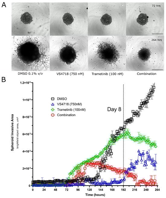Previous studies have shown that FAK and MEK inhibitors can both inhibit and promote invasion of GBM cells [45,46]. Therefore, we examined the effect of MEK and FAK inhibitor combinations in Matrigel-supported 3D spheroid invasion assays via live cell imaging (Figure 6). Representative images of spheroids at 72 h vs. 264 h are shown (Figure 6A), with quantification of spheroid invasion area (not spheroid size) showing that trametinib alone causes an initial increase in spheroid invasion area due to a more invasive phenotype, as has been reported by other studies [46]. However, time-lapse movies demonstrated that this outgrowth regresses and collapses after ~6 days of exposure to the compound (Figure 6B, green data points) (Supplementary Videos S1–S4). Similarly, the trametinib-VS4718 drug combination shows an initial increase in spheroid invasion area, which steadily declines after 72 h exposure to drug (Figure 6B, red data points), and spheroid core size shows little growth overall (Figure 6A, phase images: compare far right ‘combination’ panels at 72 vs. 264 h), indicating growth arrest. Overall, our data clearly indicate that low-dose targeting of MEK and FAK inhibitors in combination prevents 3D spheroid growth and invasion in human GBM models.