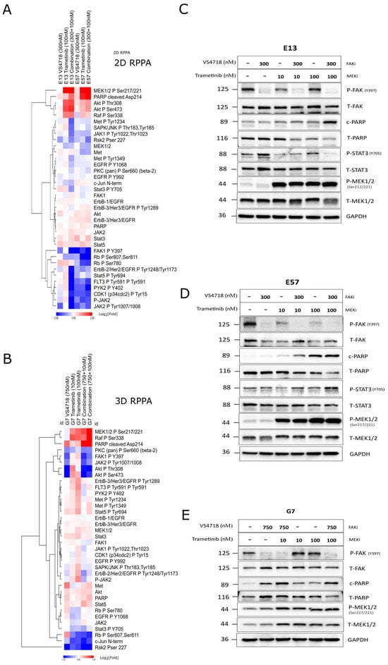 Pathway profiling of FAK+MEK inhibitor combination by Reverse-Phase Protein Array (RPPA) in 2D and 3D. (A) Two-dimensional RPPA heatmap representation of protein expression (Log2-fold changes) in resistant (E13) vs. sensitivity (E57). (B) Three-dimensional RPPA heatmap representation of protein expression (Log2-fold changes) in G7 spheroids. (C–E) Western blot validation of RPPA observations, including enhanced PARP cleavage with FAKi+MEK inhibitor combination (reproduced over a minimum of 3 separate experiments).