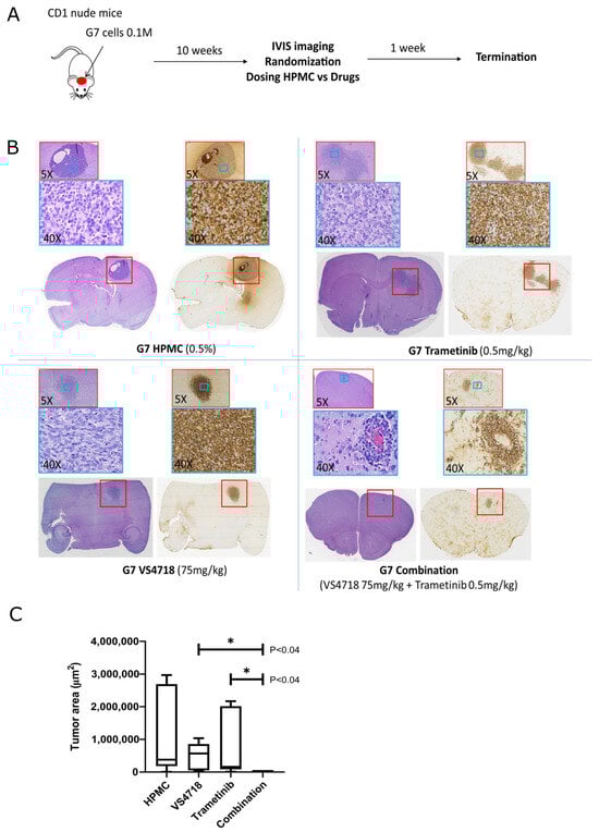 All procedures involving mice adhered to protocols approved by the Home Office in the United Kingdom under project license PP7510272 held by V.G.B. and were approved by the University of Edinburgh Animal Welfare and Ethical Review Body (PL05-21). Ten-week-old female CD-1/nude mice were intracranially implanted with NPE cells expressing a dual luciferase/GFP reporter (2 × 104) or G7 cells (2 × 105) in 2 µL of growth medium following isoflurane anesthesia. NPE-luciferase/GFP cells were provided from the CRUK Glioma Cellular Genetics Resource and have been previously described [32]. Buprenorphine was administered for analgesia during surgery and carprofen was administered in water for 48 h. Tumor cells were precisely implanted at coordinates 0.6 mm anterior and 1.5 mm lateral to the bregma, reaching a depth of 2.5 mm. Tumor growth was monitored biweekly by injecting 150 mg/kg luciferase, followed by imaging using the IVIS® Lumina S5 system. Mice bearing established tumors were randomized into different treatment groups. The treatment regimen involved administering VS4718 (75 mg/kg) twice daily (7 days a week) and/or trametinib (0.5 mg/kg) once daily (5 days a week) for a total of two weeks via oral gavage. Both the drugs were prepared in 0.5% hydroxypropyl methylcellulose solution. At the end of the treatment, mice were humanely sacrificed through cervical dislocation, and brains were collected, fixed in formalin overnight, and processed for paraffin embedding. Subsequently, sections were cut and subjected to staining with H&E, and anti-GFP (for NPE tumors) and human anti-mitochondrial antibody (for G7 tumors), using conventional techniques.