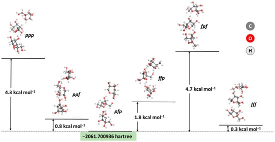 As the first step in the current research, an analysis of the most energetically favorable composition of the carbohydrate layer in the AgNPs was performed. A combination of three fructose molecules was modeled, as suggested in a previous study [59], following the computational restriction regarding the size of the studied system. Fructose is known to exist primarily in two forms: as a furanose (denoted as f) and a pyranose (denoted as p), with five- and six-membered rings, respectively [64]. Hence, six combinations between these forms were modeled, and their stability was assessed. The results obtained are presented in Figure 3.