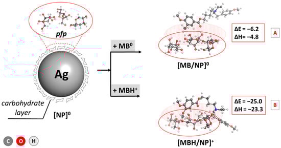Adsorption energies and enthalpies of MBH/AgNP complex formation (in kcal mol−1) for the drug in the [A] neutral form and the [B] cationic form. The structures are optimized at the B3LYP/6-311++G(d,p) level.