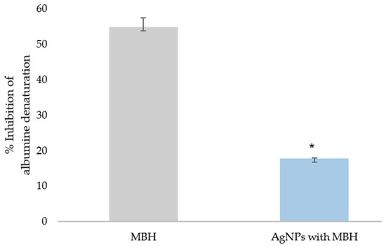 Our results for the in vitro anti-inflammatory activity of MBH and AgNPs with MBH were calculated as a percentage of the inhibition of albumin’s thermal denaturation (Figure 6). We found that MBH-loaded AgNPs exhibit three times lower activity than MBH (p < 0.05). The anti-inflammatory effect of MBH could be explained by the potential for attaching the albumin molecule via its functional groups [66]. The lesser anti-inflammatory effect of MBH-loaded AgNPs is most likely due to the interaction of MBH’s functional groups with the NPs.