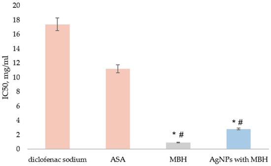 Inhibition of thermal denaturation of albumin by MBH (grey) and AgNPs with MBH (blue). The anti-inflammatory activity of the tested substances was compared to diclofenac’s and acetylsalicylic acid (ASA)’s activity (orange). The results are expressed as IC50, mg/mL. # p < 0.05 compared to diclofenac; * p < 0.05 compared to ASA.