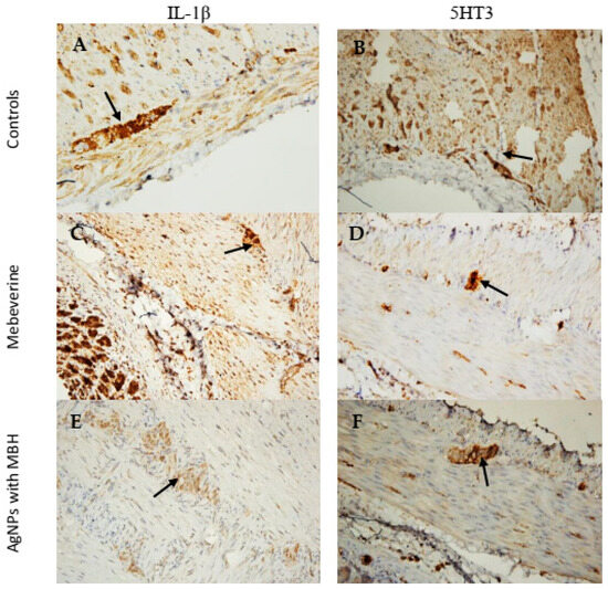 To confirm the in vitro anti-inflammatory effect of AgNPs with MBH, we also measured ex vivo IL-1β and 5HT3 expression. The data analysis revealed varying degrees of expression. Compared to the control SMs and MBH, AgNPs significantly decreased the intensity of IL-1β expression and suppressed 5HT3 expression. Our results demonstrated that AgNPs exhibited better anti-inflammatory effects in terms of IL-1β expression when compared to the control samples. Drug-loaded AgNPs also showed a superior inhibitory effect on the 5-HT3 channel receptor. Our results align with previous research demonstrating that 5-HT3 receptor antagonists, including ramosetron and ondansetron, reduce intestinal damage [81,82].