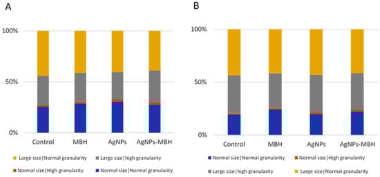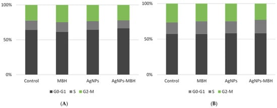Flow cytometry (BD FACSCalibur™ Flow Cytometer; Becton Dickinson & Company, Franklin Lakes, NJ, USA) was used to assess cell cycle progression and morphological changes in HepG2 cells treated with MBH, AgNPs, and AgNPs with MBH at IC50 concentrations for 24 and 72 h. The cells were fixed in 76% cold ethanol and stored at −20 °C for 24 h. Following fixation, the cells were centrifuged, washed with PBS, and incubated with 100 µg/mL RNase A at 37 °C for 30 min. Propidium iodide (PI) staining was performed using a 50 µg/mL solution for 30 min in the dark. Fifty thousand events were recorded per sample using flow cytometry with the excitation at 488 nm, and the data were analyzed using FlowJo™ software (Version 10, Becton Dickinson, Franklin Lakes, NJ, USA).