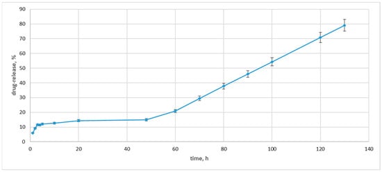 In vitro drug release was evaluated using the dialysis bag approach. A dialysis membrane was hydrated in distilled water for 24 h (MWCO 12 kDa, Sigma-Aldrich, St. Louis, MO, USA). Drug-loaded Ag NPs were dispersed in 10 mL of phosphate-buffered saline (PBS), transferred to the dialysis bag, and closed with a plastic clamp. Each bag was placed into a beaker with 40 mL of PBS (dialysis medium, pH 7.4). Aliquots with 4 mL of each dialysis medium were taken for measurements, and then the fresh medium was added at specified intervals. The drug release experiment lasted 130 h. The mean results of triplicate measurements and standard deviations were reported. Additionally, drug-only controls were made.